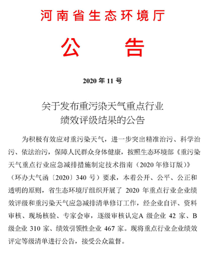 此次績效評級,是按照國家生態環境部《重污染天氣重點行業應急減排措施制定技術指南(2020年修訂版)》(環辦大氣函〔2020〕340號)有關要求,對重點行業開展的環保績效評級,經企業自評、資料審核、現場核驗、專家會審,經河南省生態環境廳經審核認定,鄭州榮盛窯爐耐火材料有限公司被評為績效引領性企業。