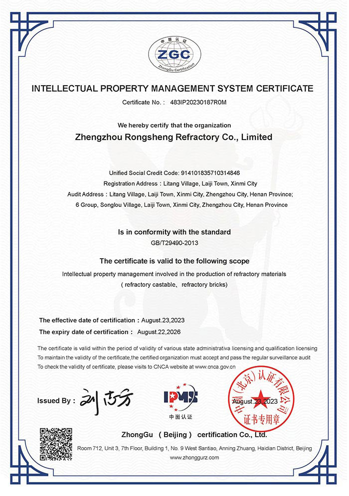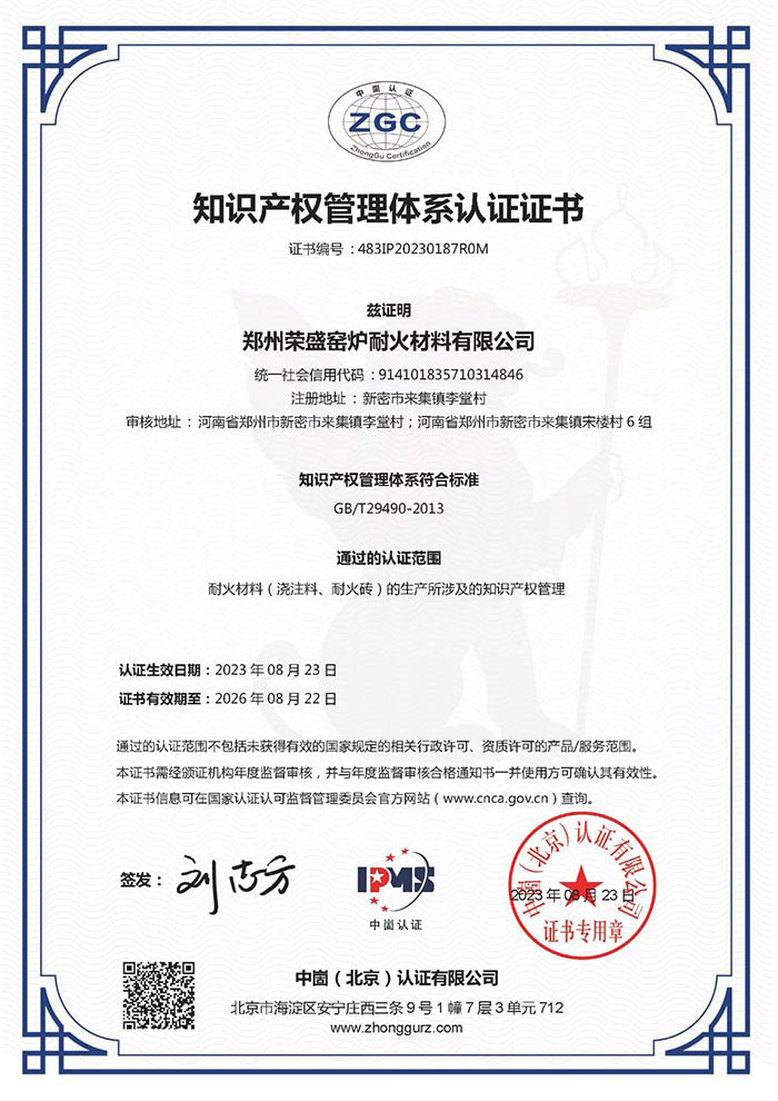 近日,鄭州榮盛窯爐耐火材料有限公司(以下簡稱「榮盛耐材」)順利通過國家知識產權貫標認證,并獲得了《知識產權管理體系認證證書》中英文雙語認證。該項認證的順利通過,標志著榮盛耐材構建了一套規范化、系統化、程序化、精細化的知識產權管理體系。