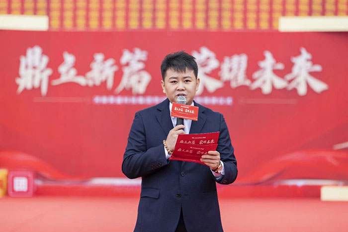 zui后,在熱情洋溢的現(xiàn)場氛圍中,河南榮盛科技集團董事長楚科奇發(fā)布了致辭。他首先代表集團向蒞臨現(xiàn)場的各位領(lǐng)導(dǎo)、嘉賓及全體員工表示熱烈歡迎與誠摯感謝。楚總回顧了集團十二年的發(fā)展歷程,指出新材料生產(chǎn)基地的建成,凝聚了全體榮盛人的智慧、汗水與堅守,是企業(yè)十二年奮斗征程上的重要里程碑,更是企業(yè)面向未來、決勝未來的戰(zhàn)略新起點。楚總強調(diào),新工廠的順利落成,得益于各級主管部門的大力支持與高效服務(wù),也離不開集團管理層的高效協(xié)同與一線團隊的奮力拼搏。他特別感謝了王海軍總經(jīng)理及集團管理層,稱贊其在項目戰(zhàn)略定位與資源配置中發(fā)揮的關(guān)鍵作用;同時,他也向宋廣林總經(jīng)理及全體建設(shè)者致敬,感謝他們不畏艱辛、全力以赴,將一片荒蕪之地打造為現(xiàn)代化智能工廠。