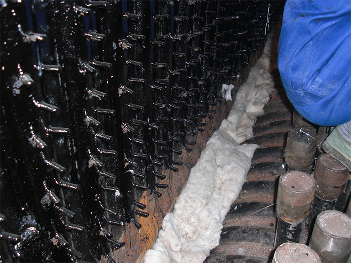 因金屬材料與耐磨材料受熱后線脹系數(shù)的差異,在耐磨耐火材料施工前,必需在金屬材料( 包括銷釘, 托板及管子) 表面涂瀝青, 涂刷瀝清是在澆注料與受熱面之間留有一定的間隙, 運行時受熱面熱膨脹差不會對耐磨材料造成破壞。