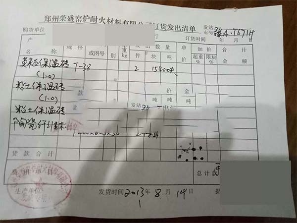 8月14日,鄭州榮盛耐材向?qū)幉ǹ蛻魷?zhǔn)時(shí)發(fā)貨,這次發(fā)出的產(chǎn)品主要包括1540塊密度為1.0的T-38莫來(lái)石保溫磚、1540塊密度為1.0的T-38粘土保溫磚、730塊T-3 粘土保溫磚和24箱1200*600*50的陶瓷纖維板。