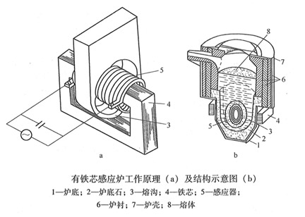 有芯感應爐是有鐵芯穿過感應器并用工頻電源供電,利用電磁感應原理使金屬爐料發(fā)熱熔化的設備。有芯感應爐具有加熱快、生產(chǎn)率高、金屬燒損少、操作方便、投資少、經(jīng)濟效益顯著等優(yōu)點,廣泛應用于化鐵、化銅、化鋅、化鋁等行業(yè),特別是對于單一品種大批量冶煉的物料具有其優(yōu)越性。